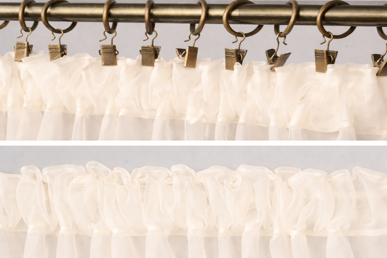 Posiada obszyte boki i u góry wszytą taśmę marszczącą nadającą się do wieszania na żabki lub haczyki.