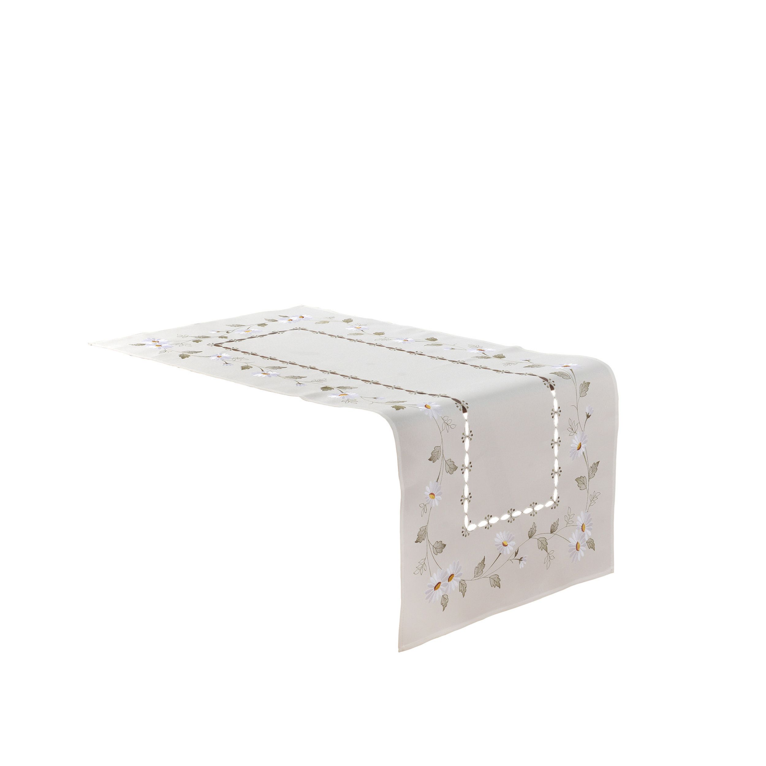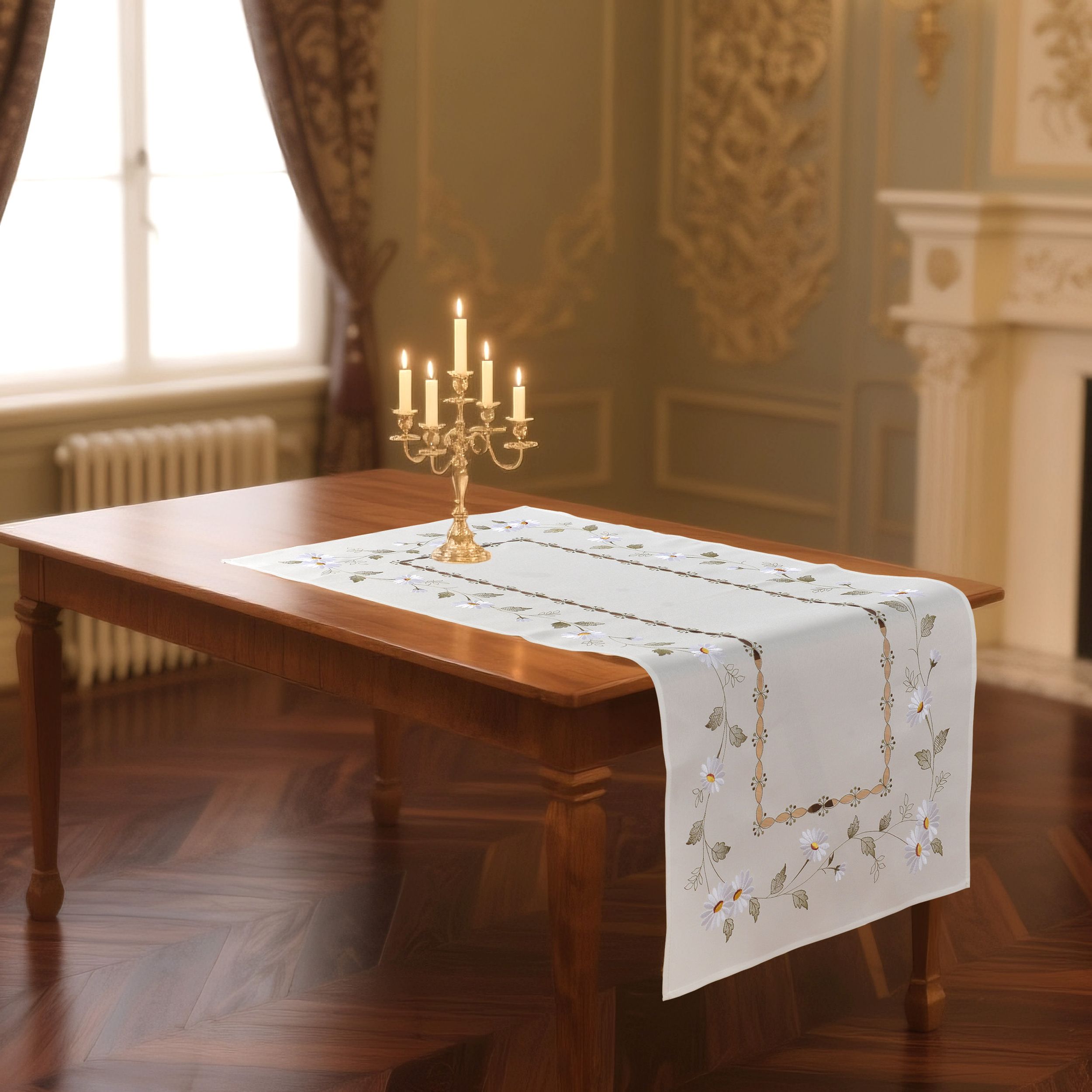 Bieżnik dekoracyjny wykonany z miękkiej i przyjemnej w dotyku tkaniny zdobionej haftem.