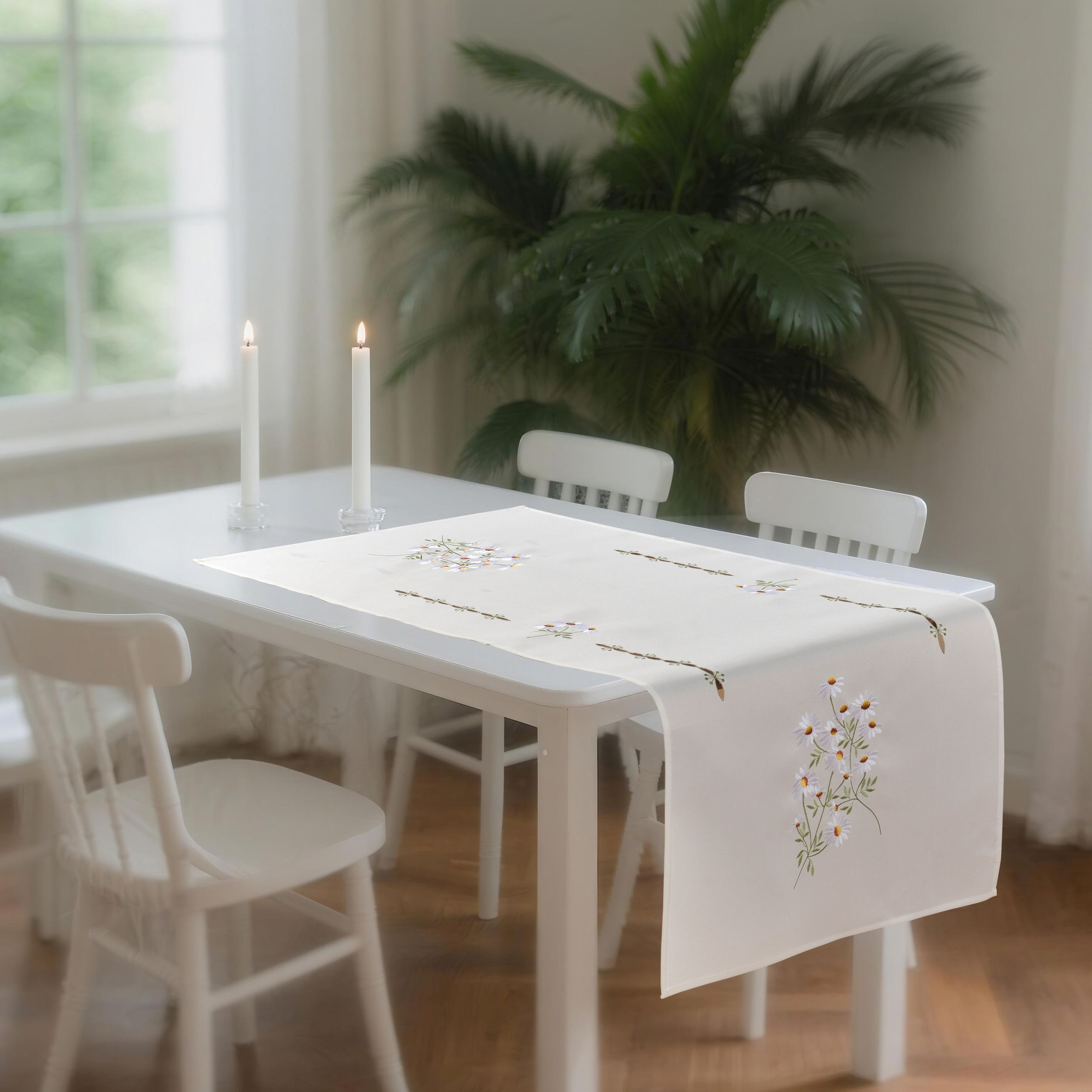 Elegancki bieżnik w jasnym, kremowo-białym odcieniu to piękna dekoracja stołu, ławy która przyciąga uwagę subtelnym, kwiatowym wzornictwem. Całość tworzy lekki, świeży i bardzo przyjemny wizualnie efekt. Bieżnik pięknie układa się na stole, a jego staranne wykończenie podkreśla dbałość o detale.
