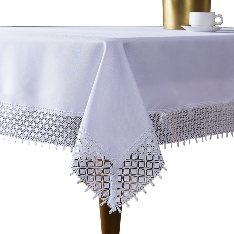 To wytworny obrus z poliestru, wykończony szeroką gipiurą o finezyjnym wzorze rombów. Starannie wykonana koronka nadaje mu subtelny, lecz efektowny charakter, sprawiając, że idealnie wpasuje się zarówno w eleganckie, jak i bardziej klasyczne wnętrza. Różnorodność dostępnych rozmiarów pozwala dopasować go do każdego stołu, czyniąc go doskonałym wyborem na uroczystości oraz do codziennej dekoracji.