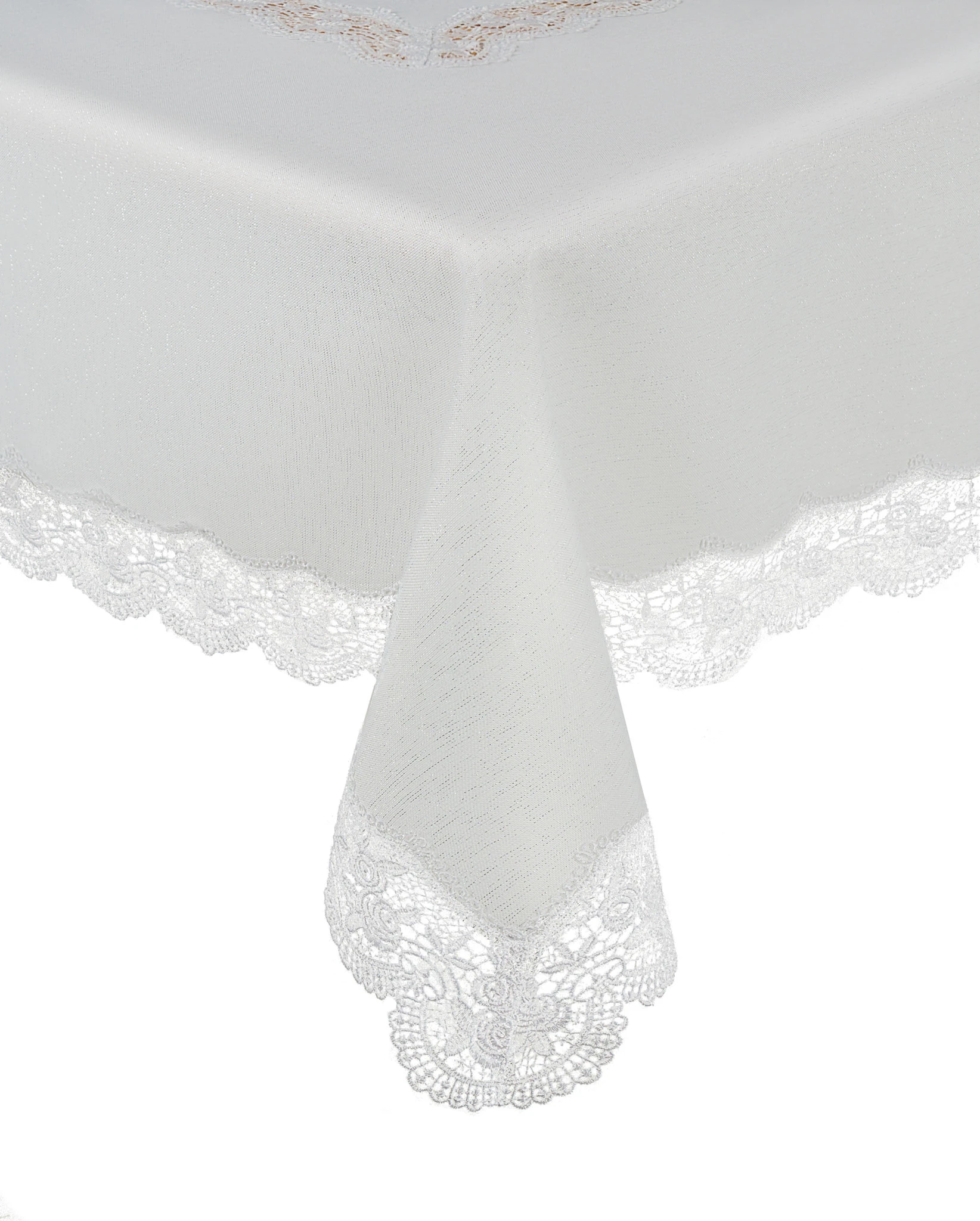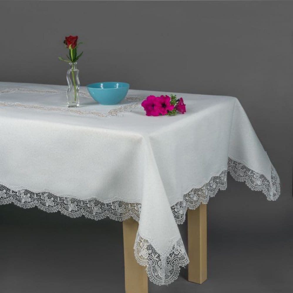 Obszyty delikatną gipiura w kolorze białym.