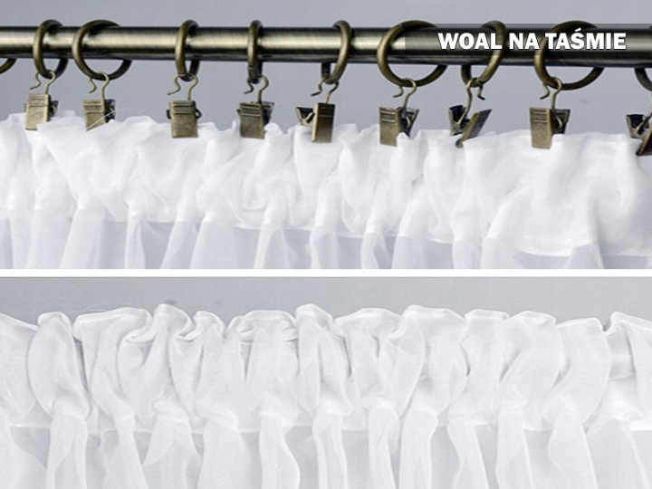 Posiada obszyte boki i u góry wszytą taśmę marszczącą nadającą się do wieszania na żabki lub haczyki.
