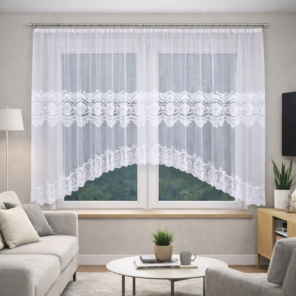 Firana gotowa -  odpasowana wykonana z przędzy żakardowej.