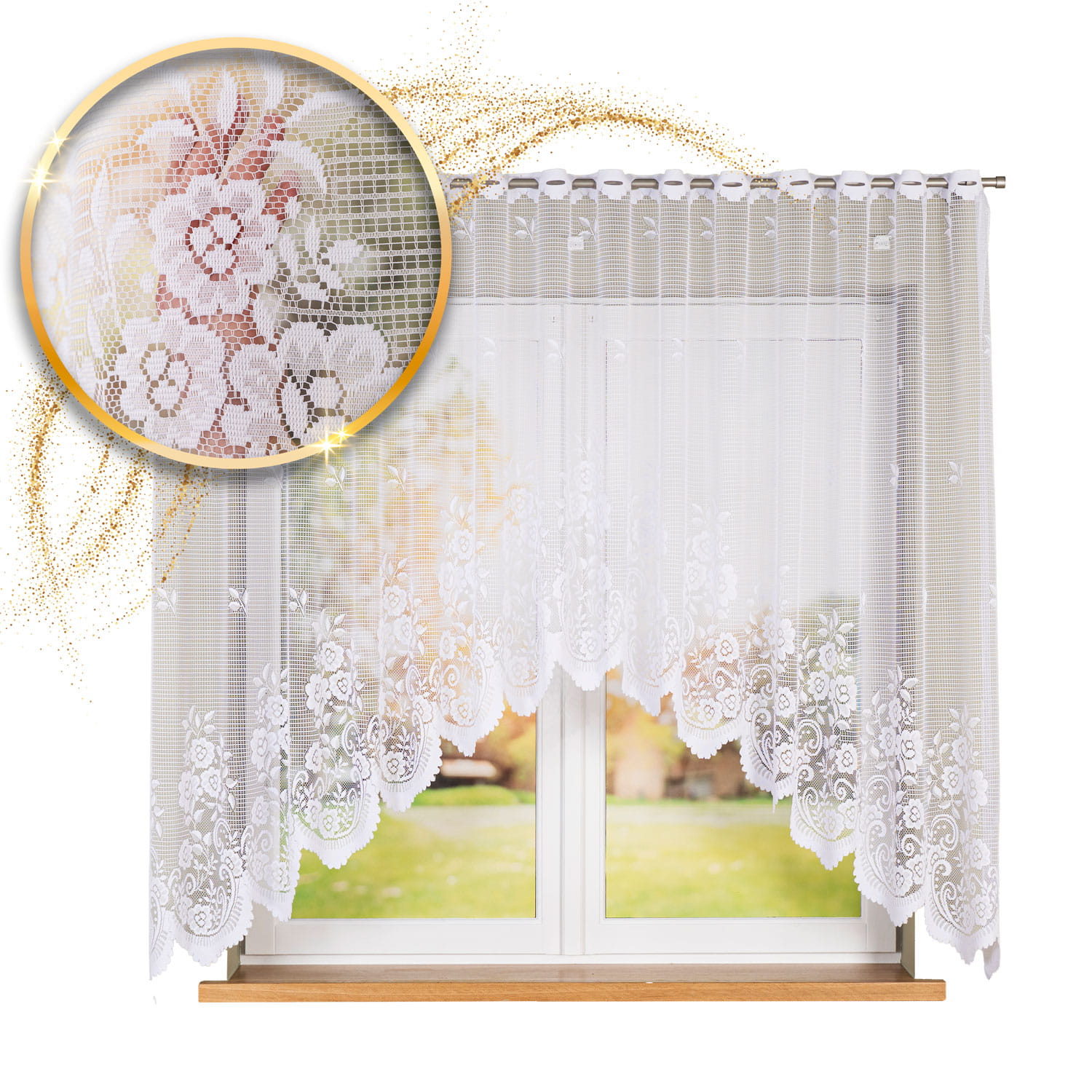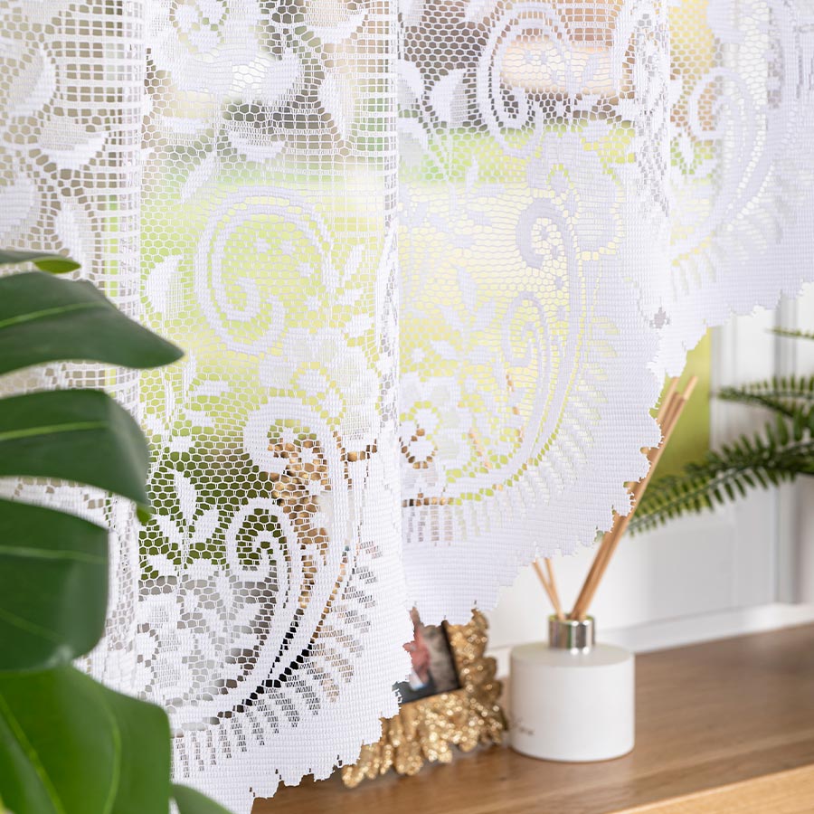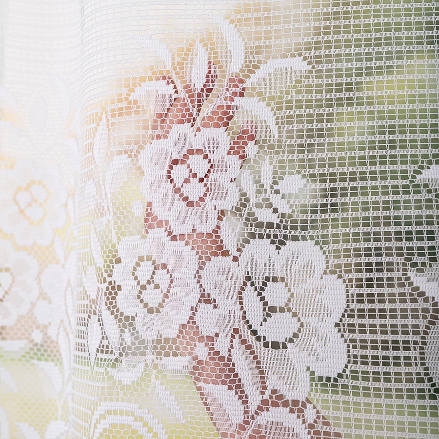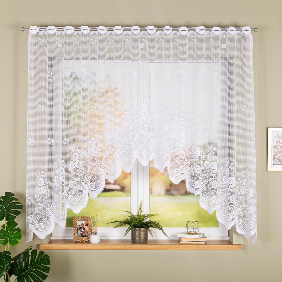 Firanka posiada u góry dziurki do nasunięcia na karnisz.
