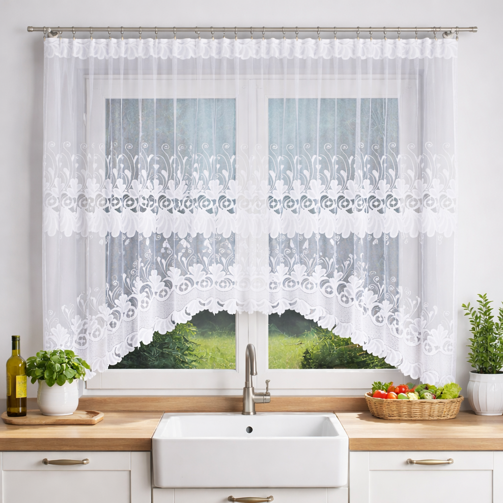 Firana gotowa -  odpasowana wykonana z przędzy żakardowej.