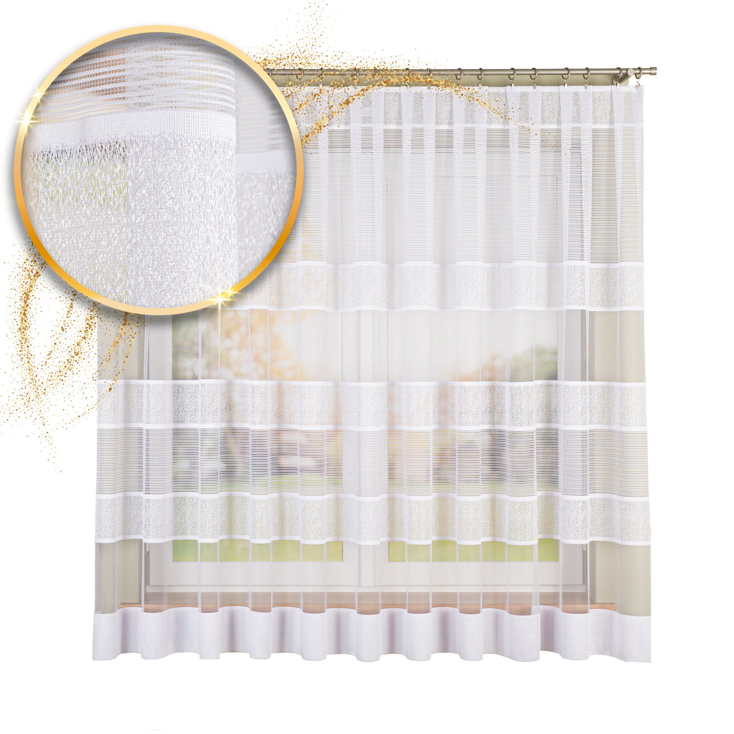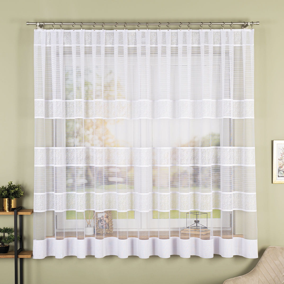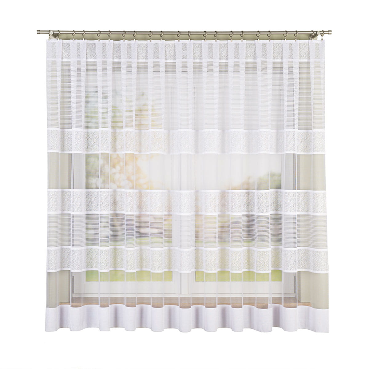 Firanka żakardowa wykonana z wysokiej jakości przędzy nabłyszczanej.