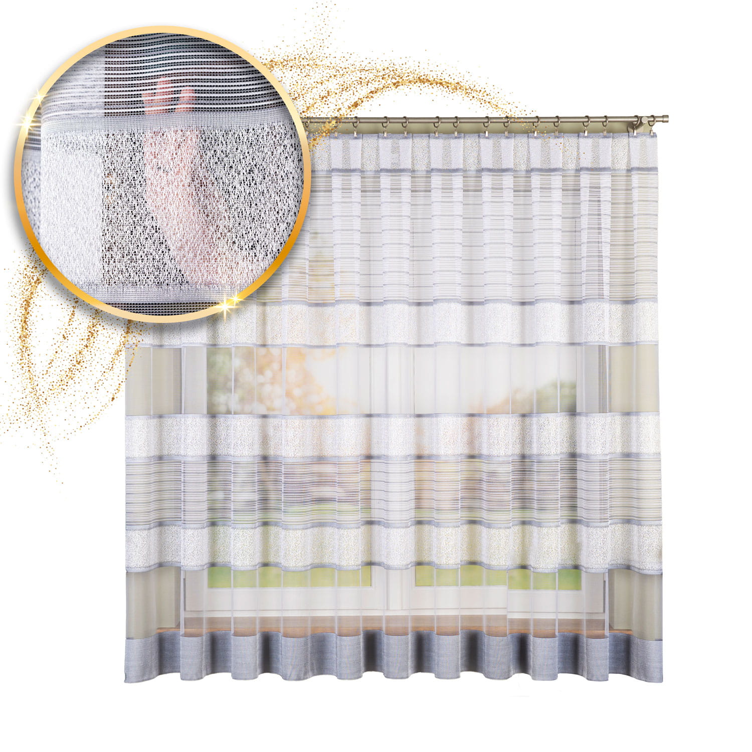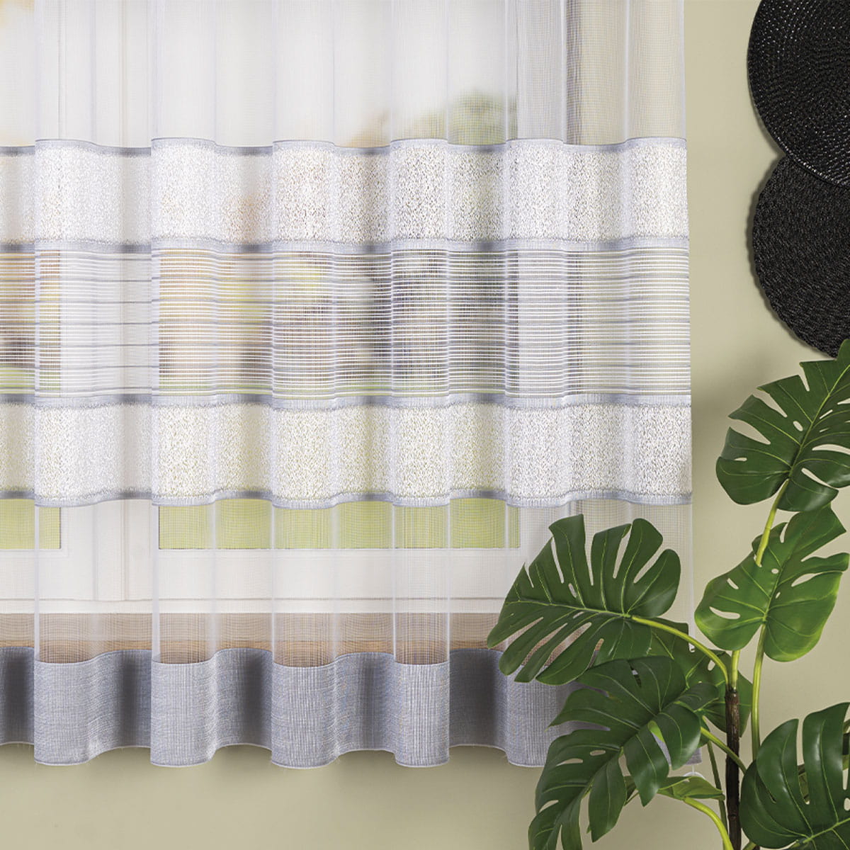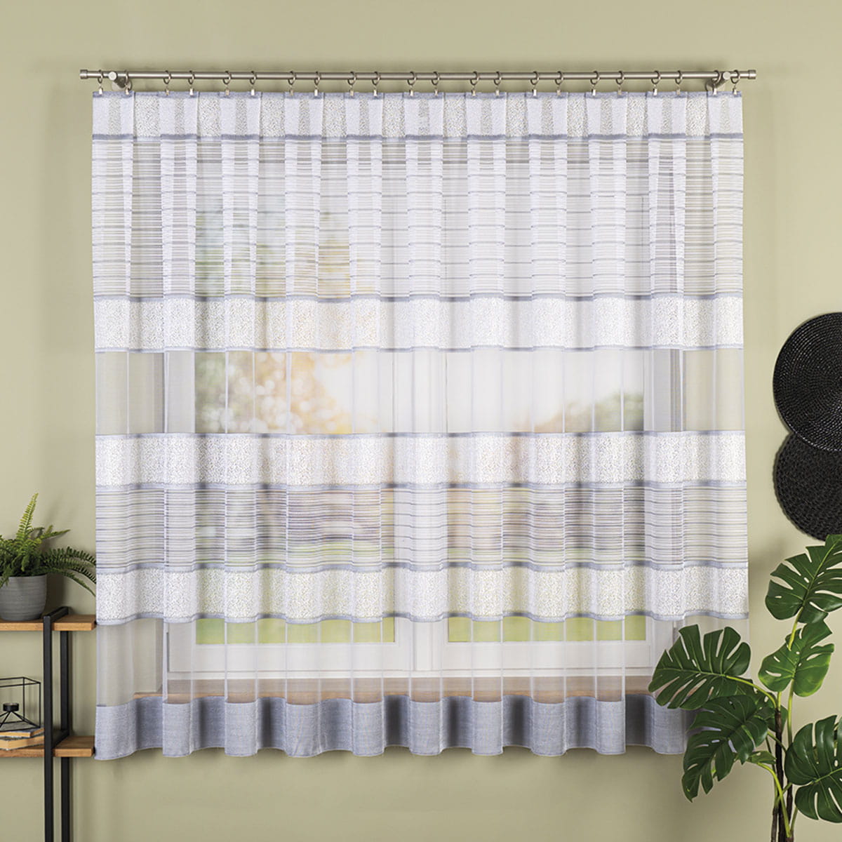 Firanka żakardowa wykonana z wysokiej jakości przędzy nabłyszczanej.