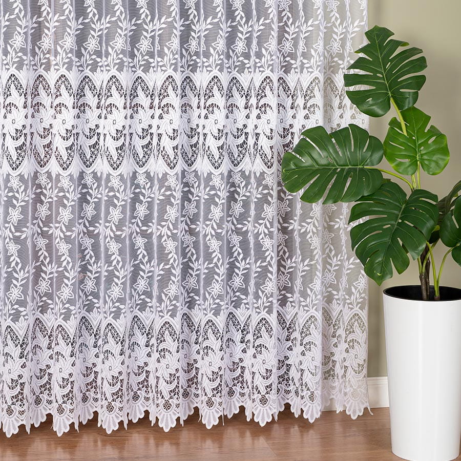 Firanka żakardowa wykonana z wysokiej jakości przędzy nabłyszczanej.