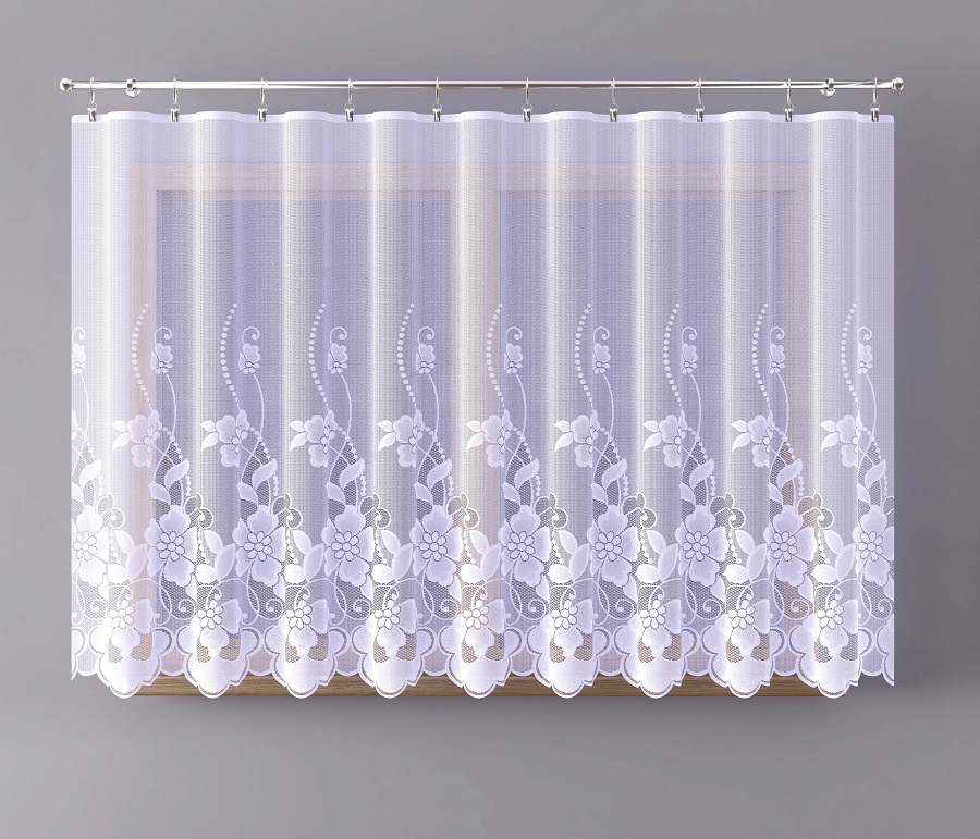 Firanka żakardowa wykonana z wysokiej jakości przędzy nabłyszczanej.