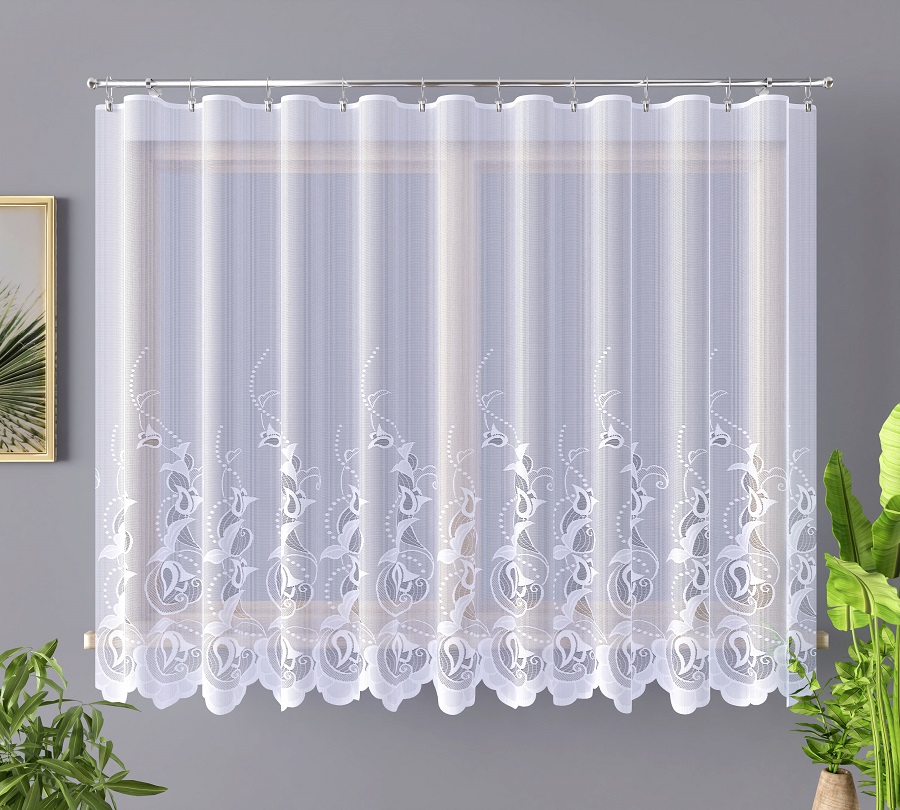 Firanka żakardowa wykonana z wysokiej jakości przędzy nabłyszczanej.