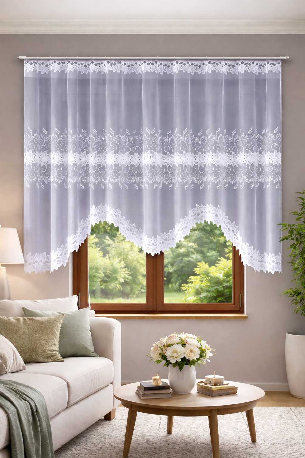 Firana gotowa - odpasowana wykonana z przędzy żakardowej.