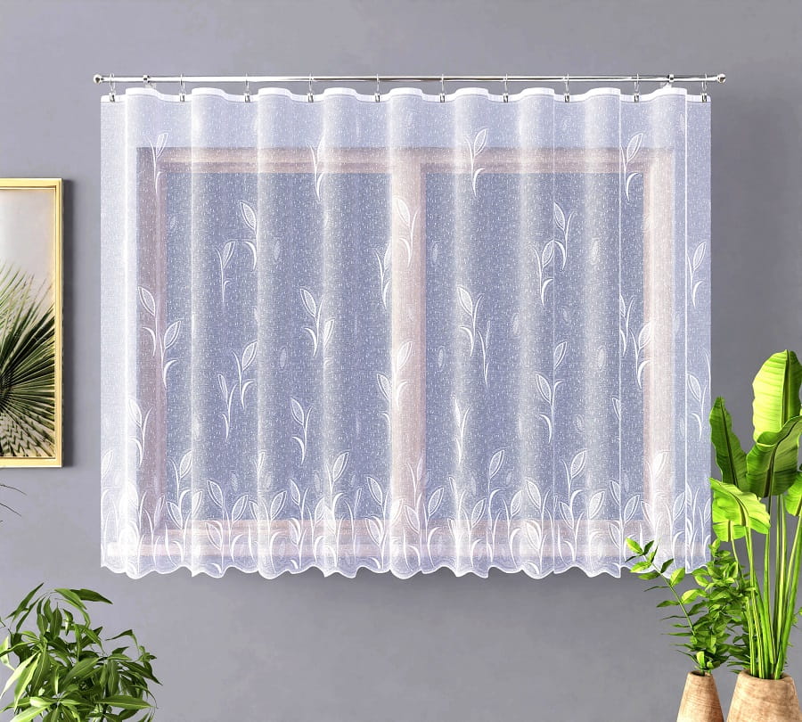Firanka żakardowa wykonana z wysokiej jakości przędzy nabłyszczanej.