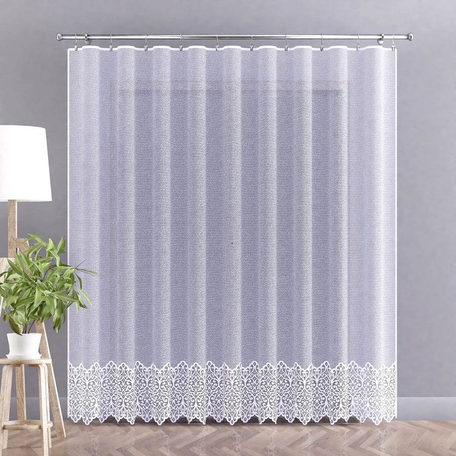 Firanka żakardowa wykonana z wysokiej jakości przędzy nabłyszczanej.