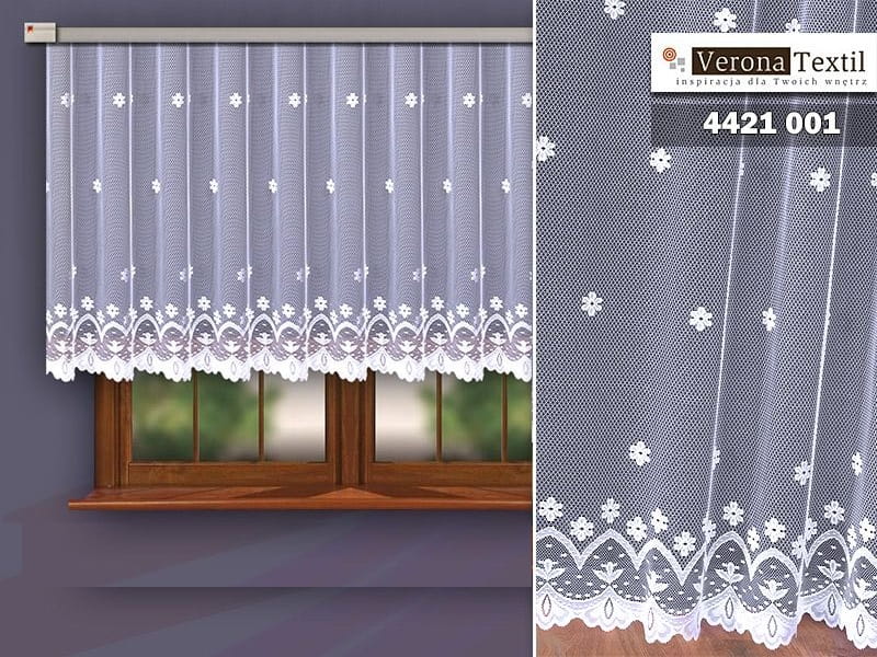Firanka żakardowa wykonana z wysokiej jakości przędzy nabłyszczanej.