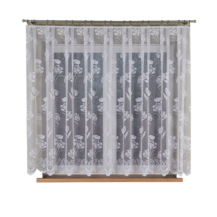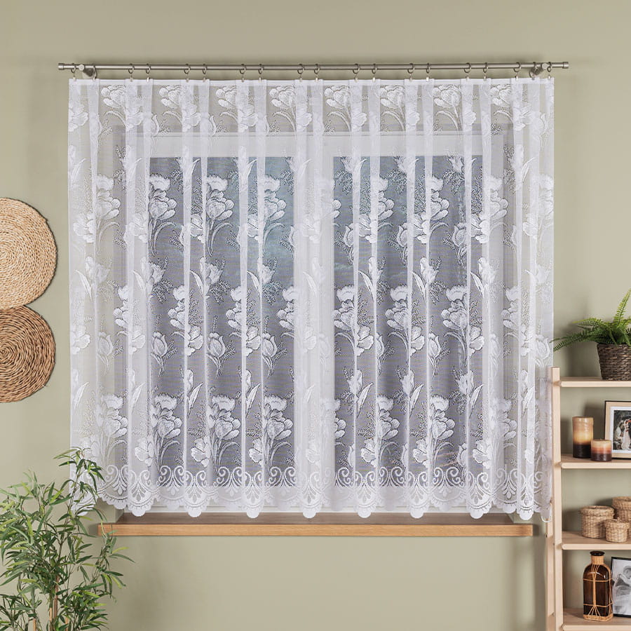 Firanka żakardowa wykonana z wysokiej jakości przędzy nabłyszczanej.