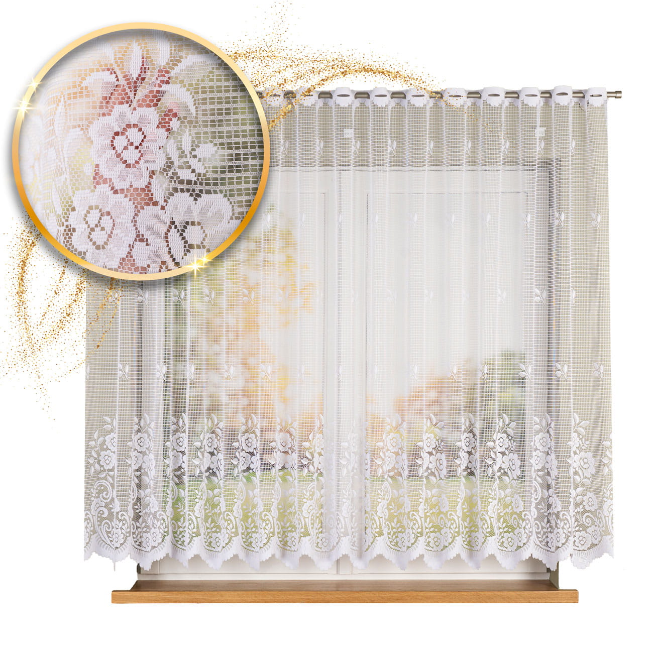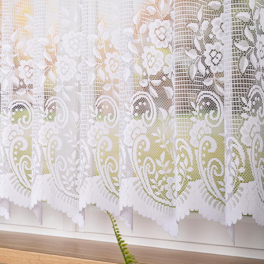 Firanka żakardowa wykonana z wysokiej jakości przędzy żakardowej.