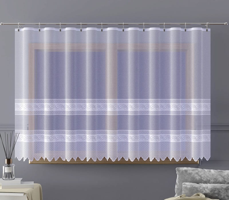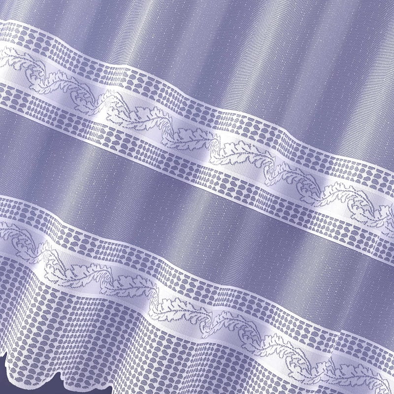 Firanka żakardowa wykonana z wysokiej jakości przędzy nabłyszczanej.