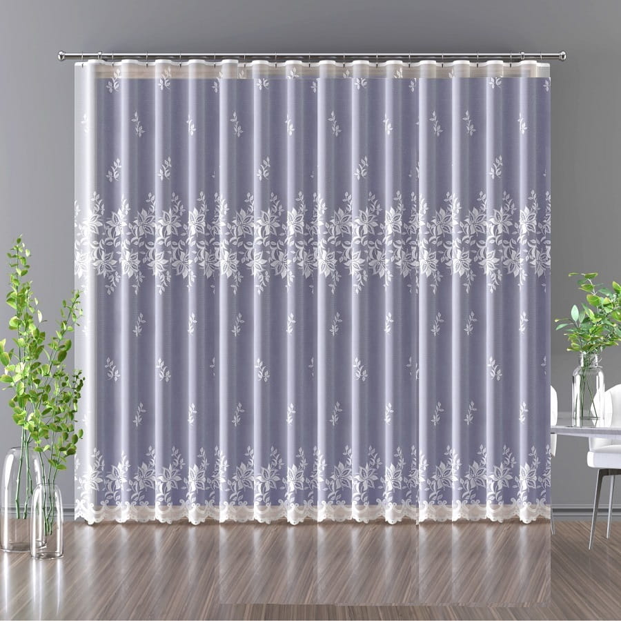 Firanka żakardowa wykonana z wysokiej jakości przędzy nabłyszczanej.