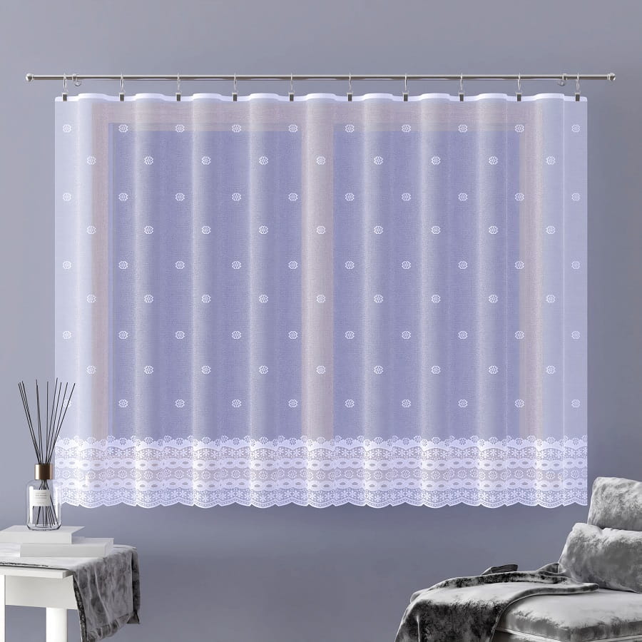 Firanka żakardowa wykonana z wysokiej jakości przędzy nabłyszczanej.