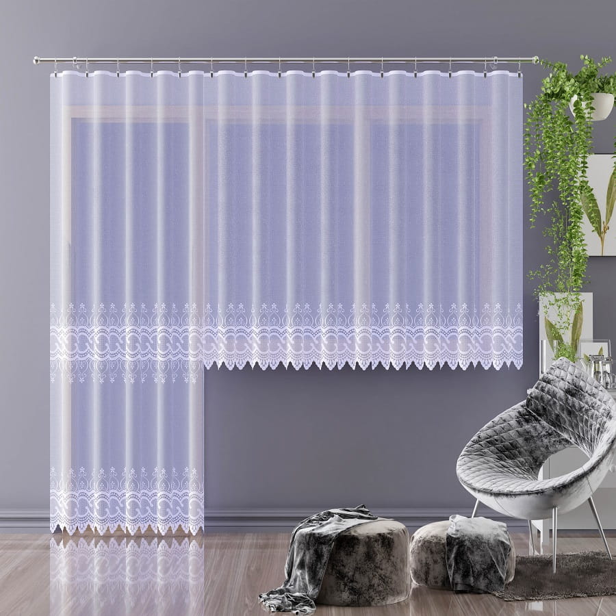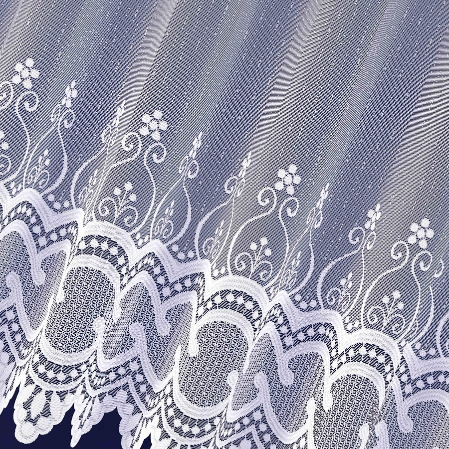 Firanka żakardowa wykonana z wysokiej jakości przędzy nabłyszczanej.