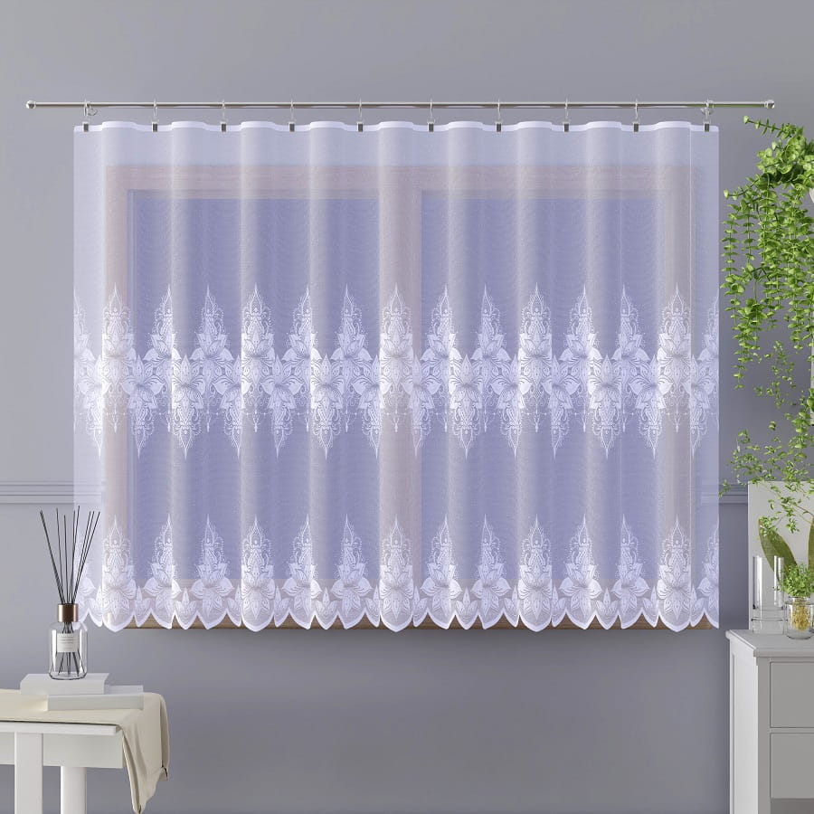 Firanka żakardowa wykonana z wysokiej jakości przędzy nabłyszczanej.