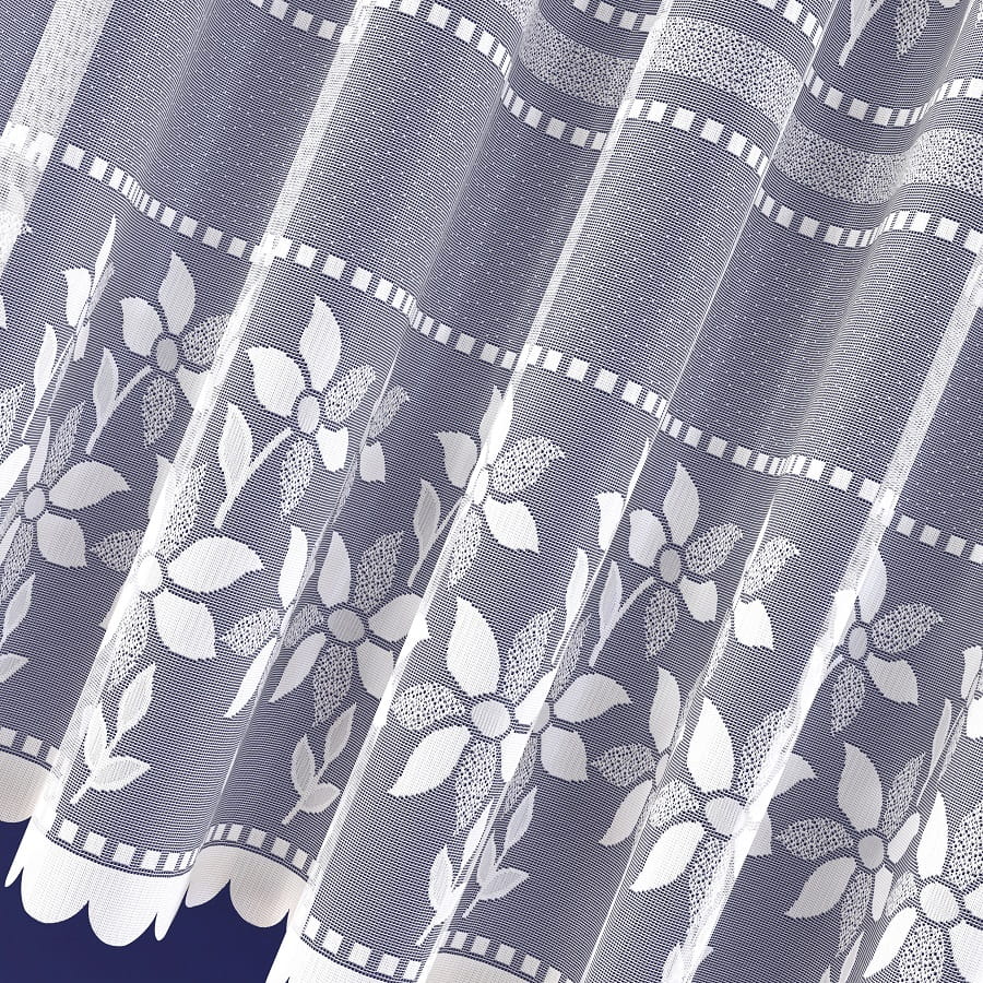 Firanka żakardowa wykonana z wysokiej jakości przędzy nabłyszczanej.