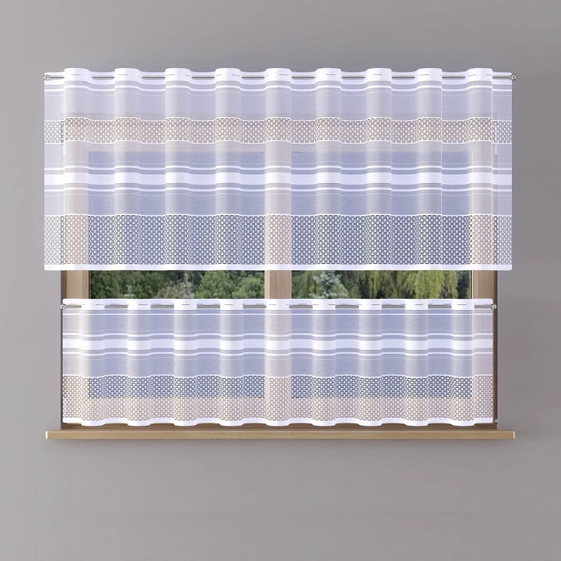 Firanka żakardowa wykonana z wysokiej jakości przędzy nabłyszczanej.