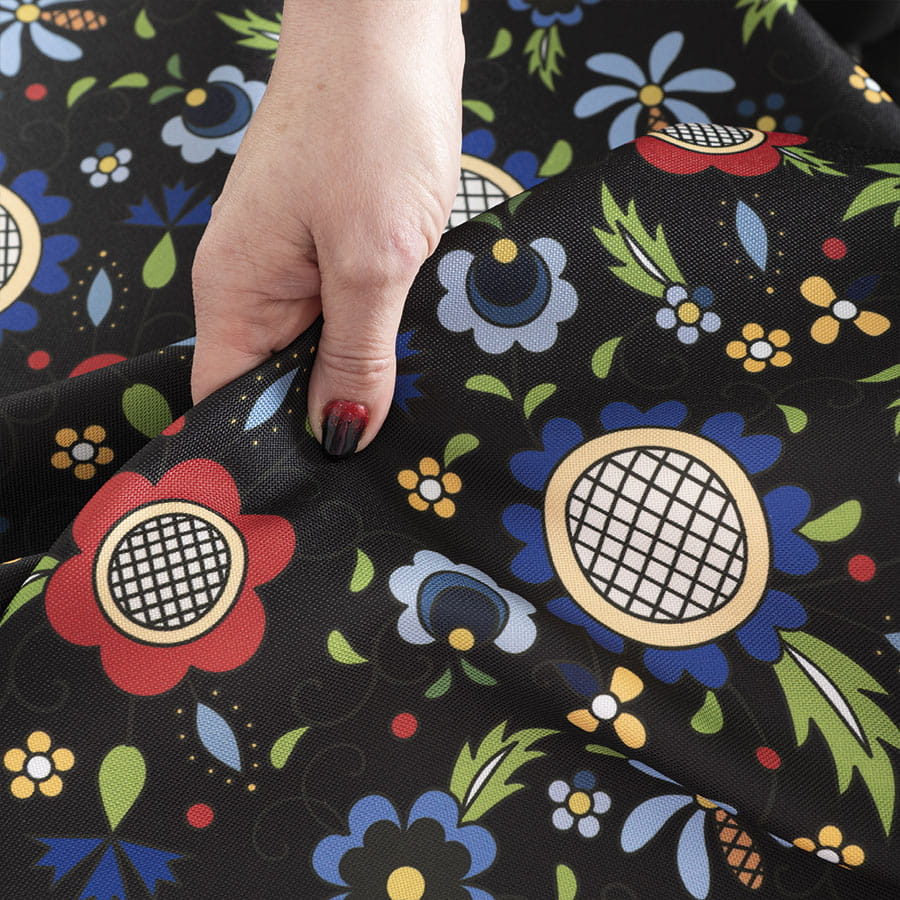 Wodoodporna tkanina na metry z motywem folkowym, to dekoracja o wszechstronnym zastosowaniu. Dzięki swoim właściwościom hydrofobowym, zapobiegającym szybkiemu przesiąkaniu płynów, możesz użyć jej nie tylko jako zasłony, ale także dekorację stołu w postaci obrusa czy nakładki, ale też jako dekoracyjne poszewki. Tkanina pasuje, do wielu stylów wnętrzarskich dodając im koloru i naturalnego ciepła.