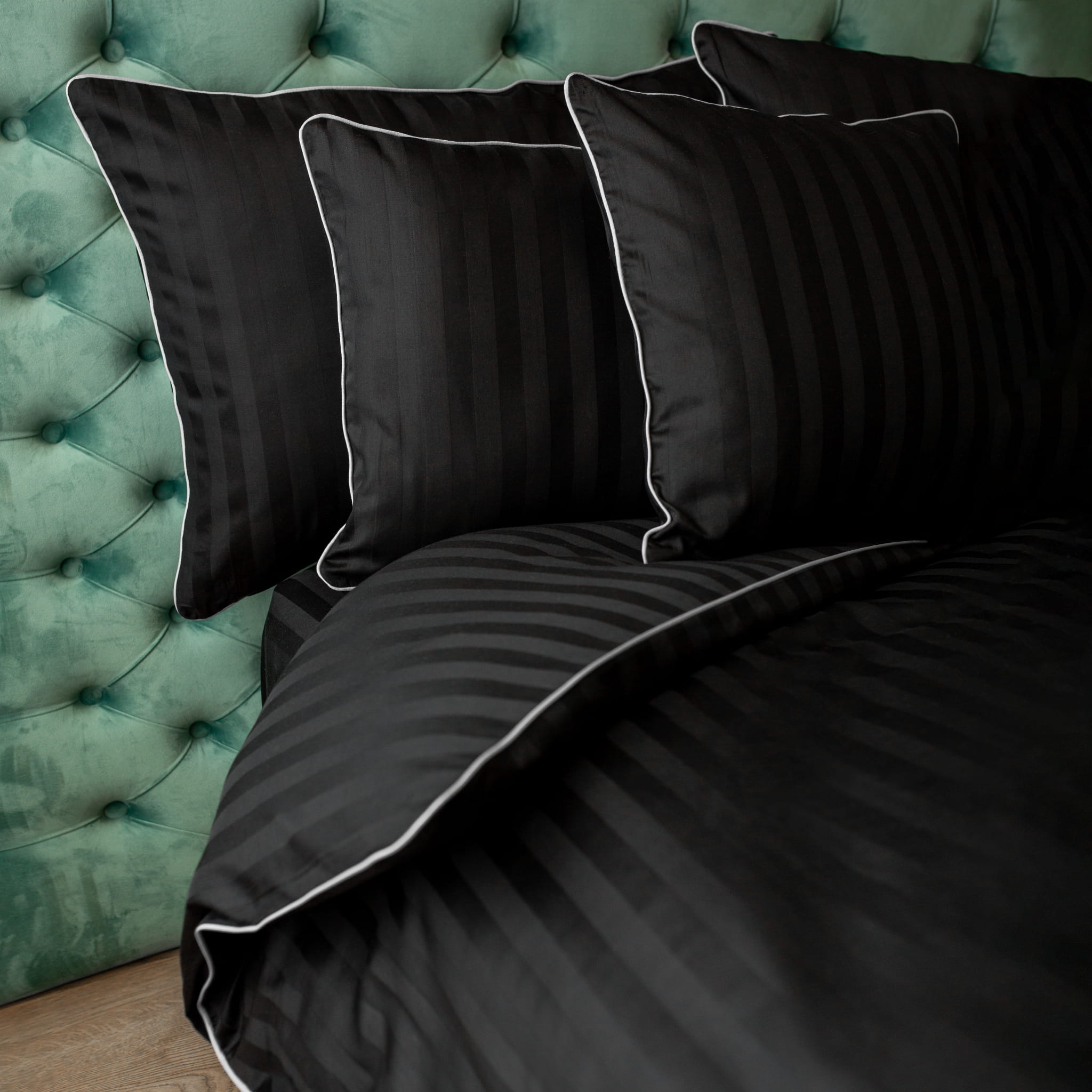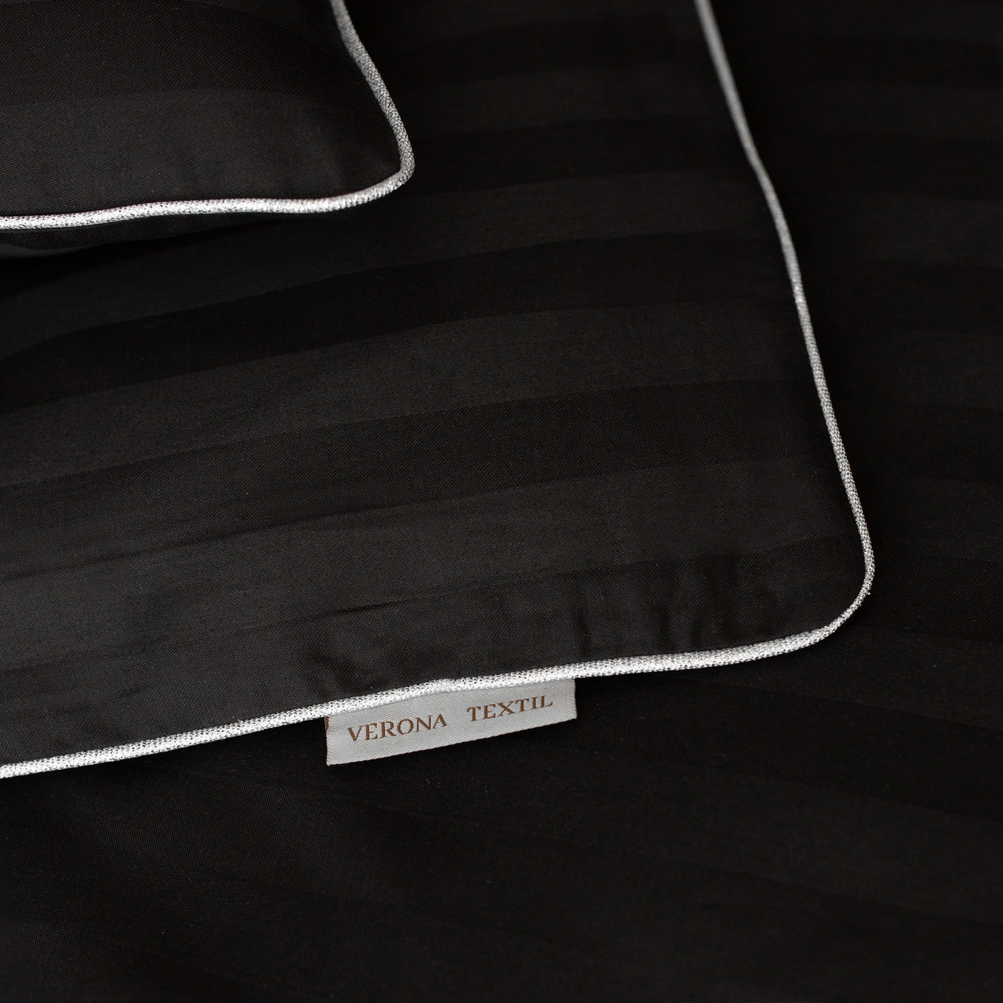 Komplet czarnej pościeli bambusowej ze srebrną lamówką szyty z największą starannością przez nasze doświadczone krawcowe.