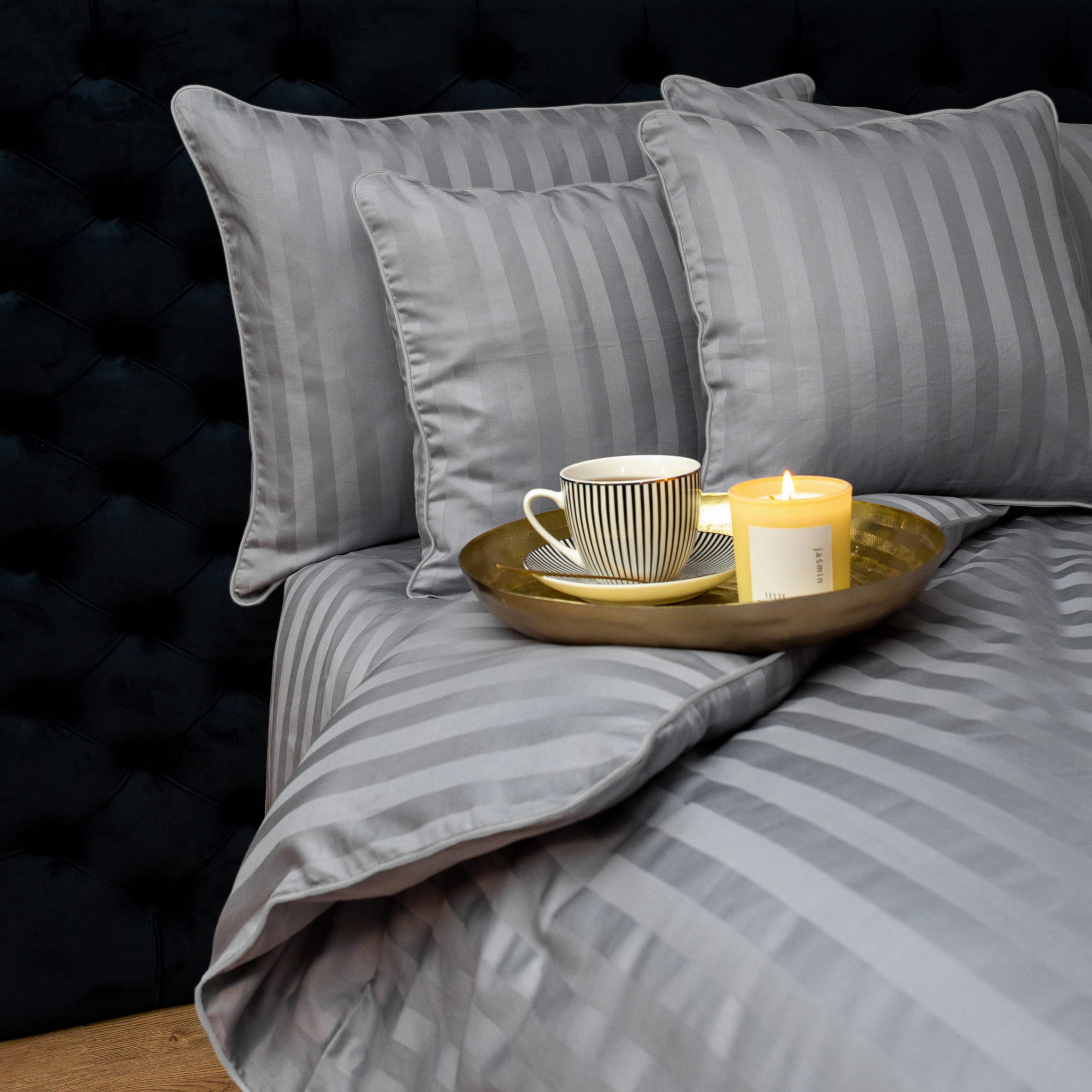 Komplet szarej pościeli bambusowej z jasno szarą lamówką szyty z największą starannością przez nasze doświadczone krawcowe.