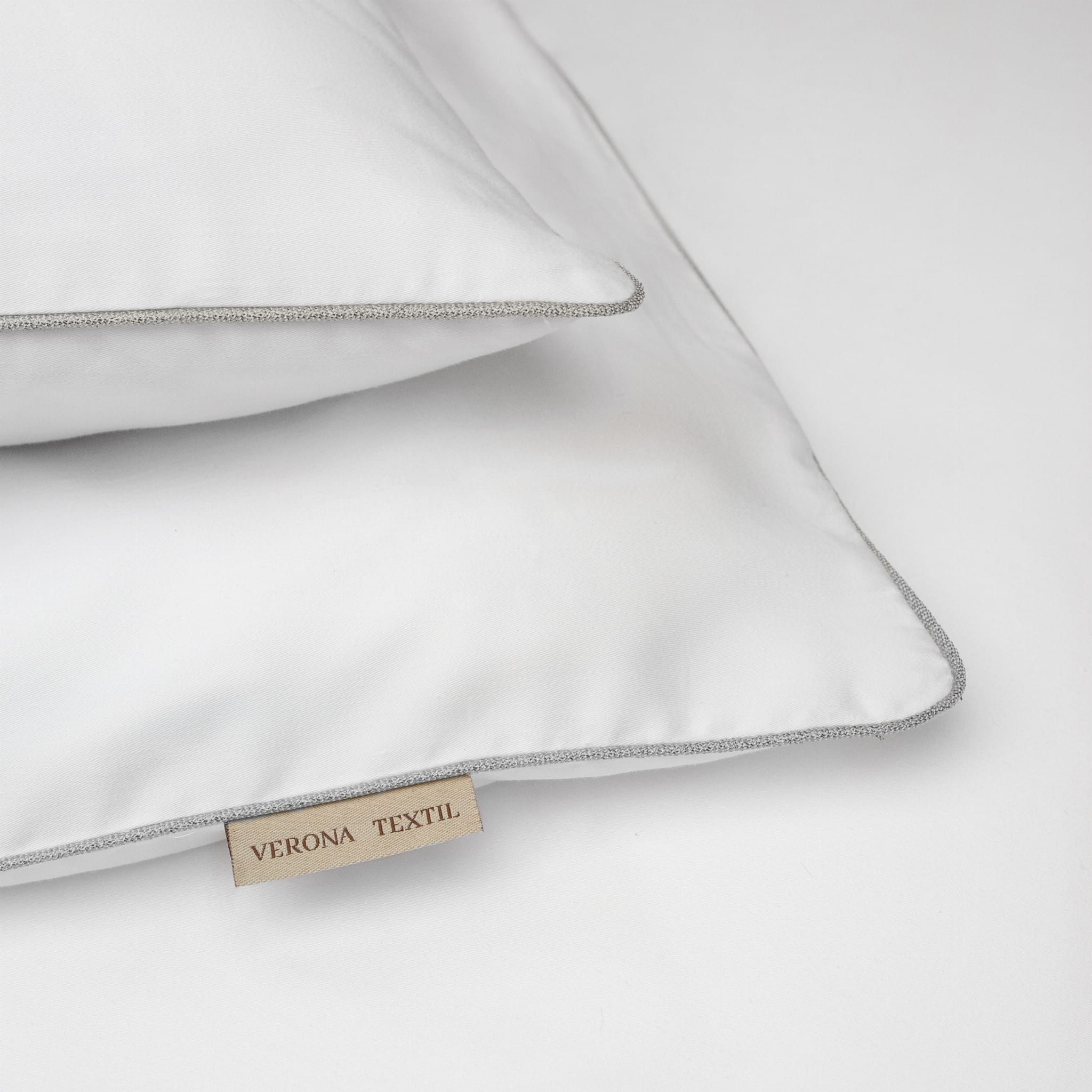 Komplet białej pościeli z satyny bawełnianej ze srebrną lamówką szyty z największą starannością przez nasze doświadczone krawcowe.