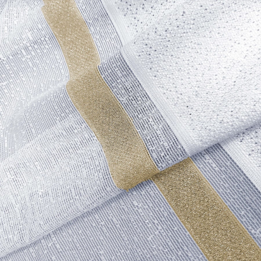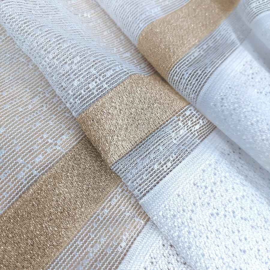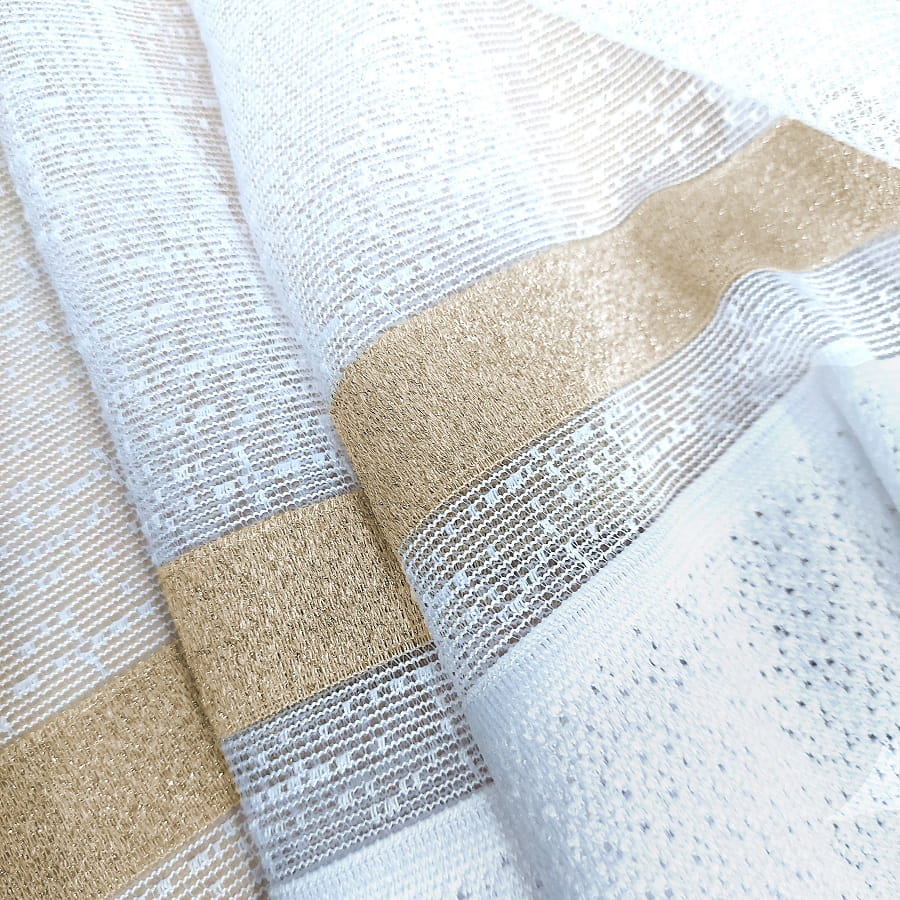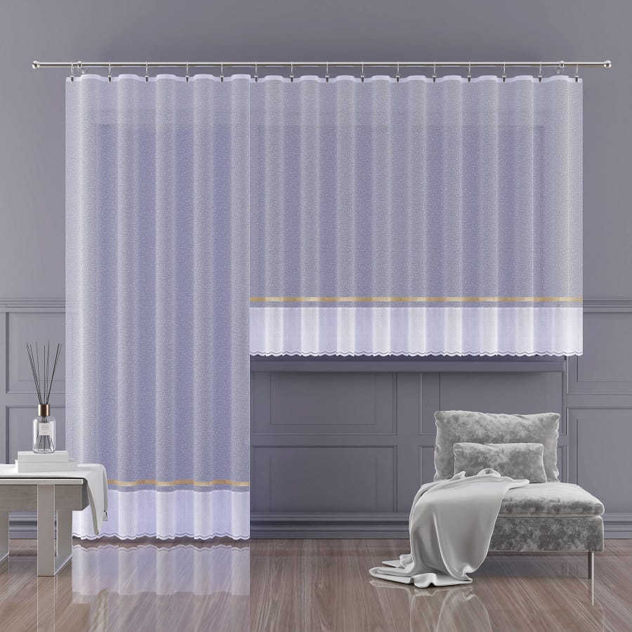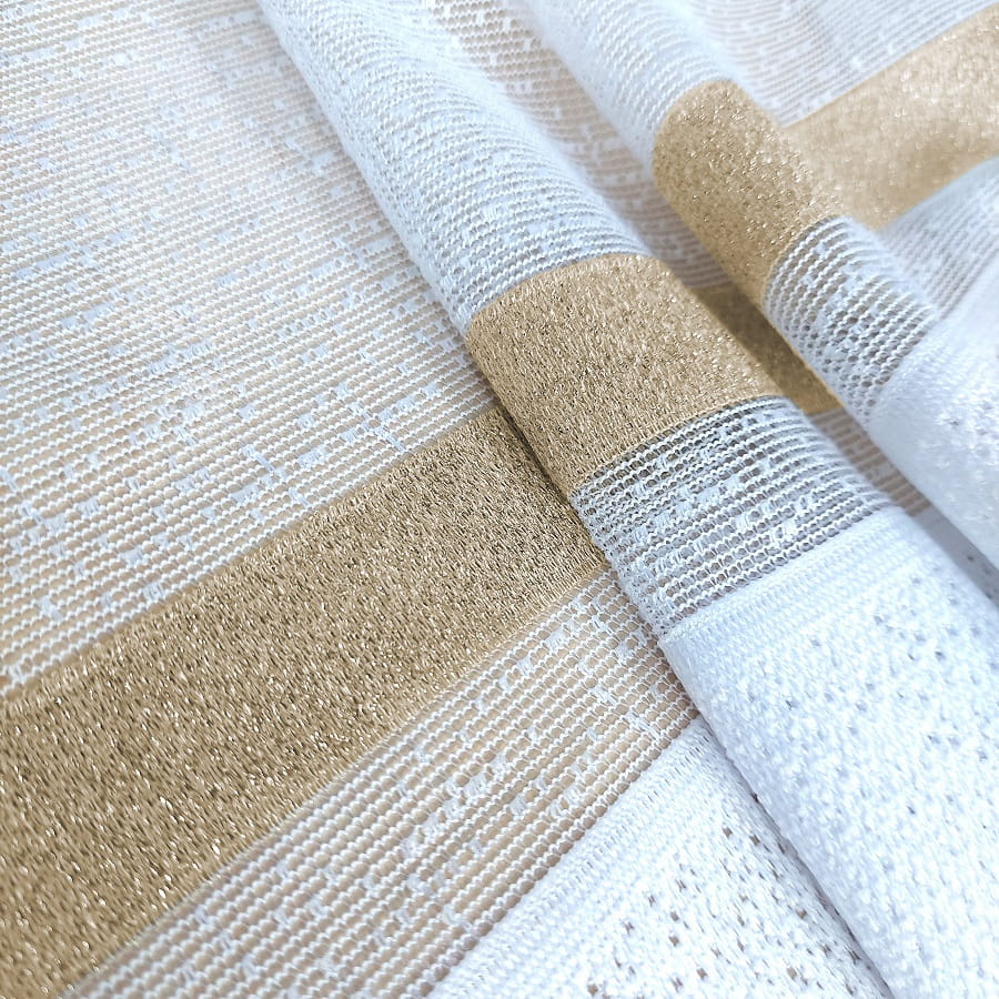 Firana dostępna w kolorze białym ze złotym paskiem .