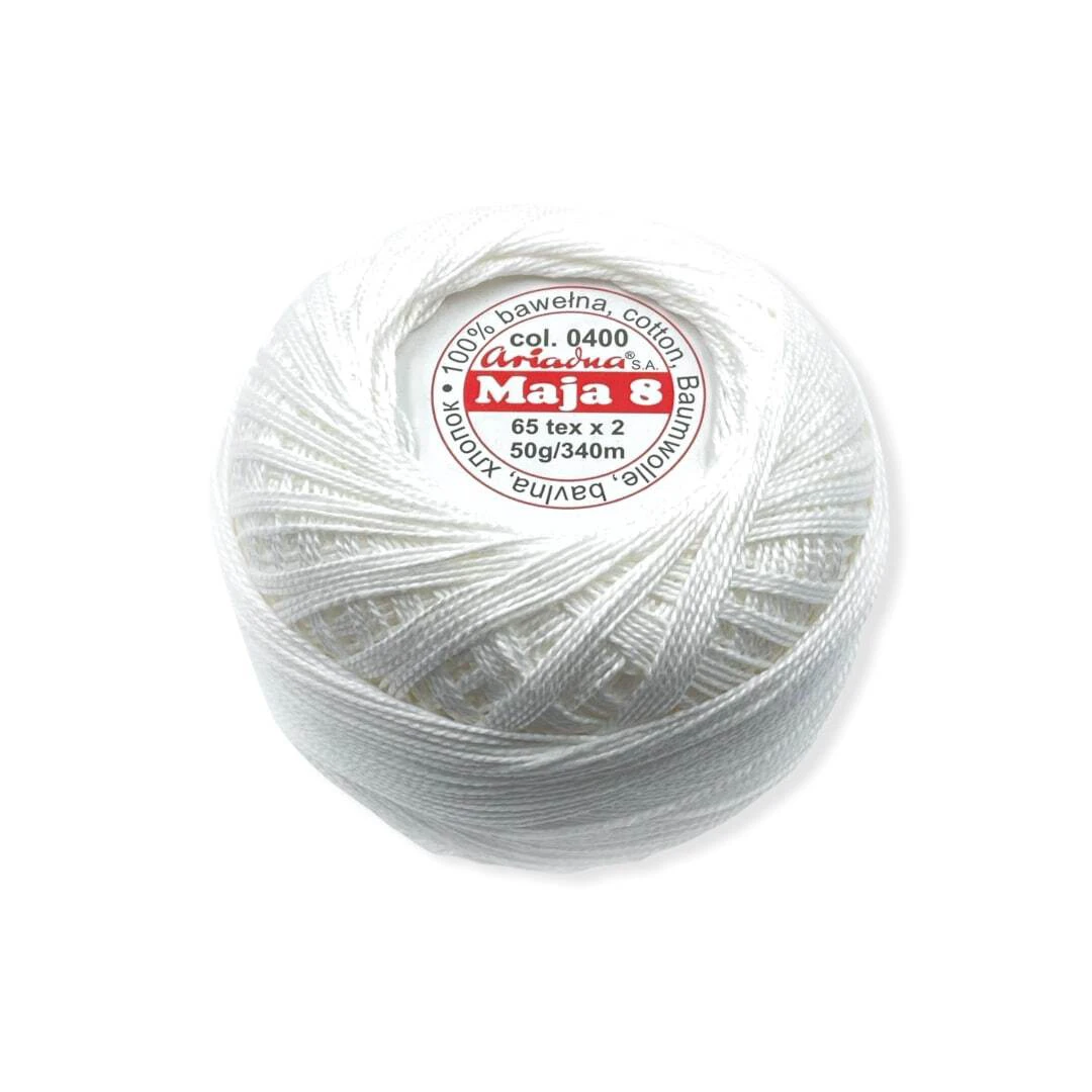 Kordonek Maja 8 polskiego producenta Ariadna. Wykonany z długowłóknistej bawełny czesanej, opalany i podwójnie merceryzowany kordonek bardzo dobrej jakości o wadze 50g.