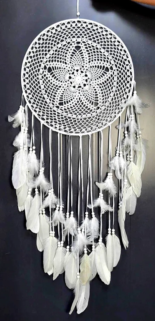 Piękny i starannie wykonany Łapacz snów z piórkami udekorowany drewnianymi koralikami w kolorze białym. Środek koła ozdobiony jest koronkowym, szydełkowym haftem, natomiast obrzeże aksamitnym materiałem. Dół udekorowany delikatnymi piórkami