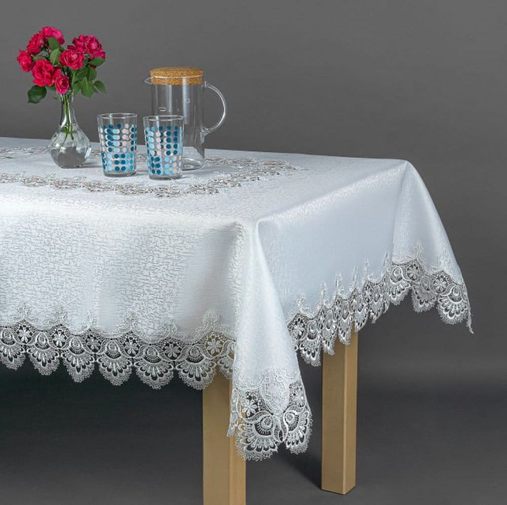 Przedmiotem sprzedaży jest elegancki obrus plamoodporny wykończony gipiurą.