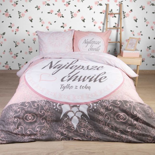 Piękny, kobiecy motyw w dekoracyjny wzorzysty szary wzór z dodatkiem różowego elementu, doskonale sprawdzi się w sypialni. Pościel jest doskonałym pomysłem na prezent dla najbliższej osoby.