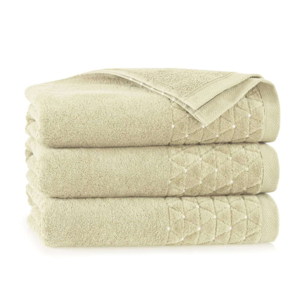 Ręcznik ozdobiony został pomysłową welurową bordiurą w postaci kilku rzędów trójkątów i żakardowych kwadratów.