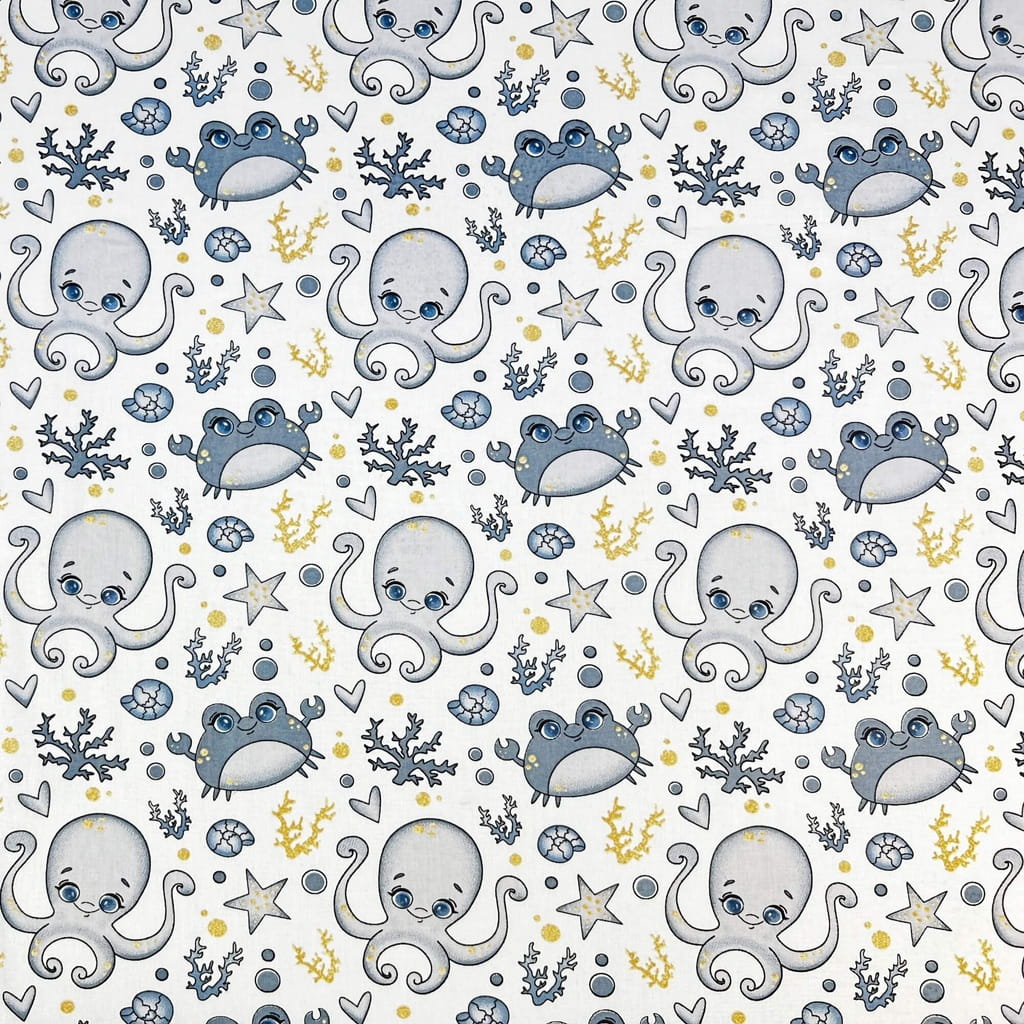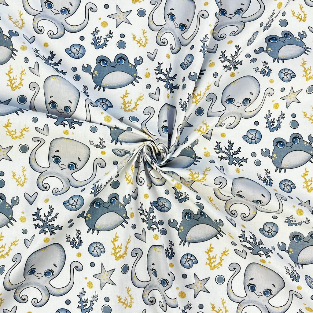 Tkanina bawełniana wzór morski ośmiornice i kraby szare
