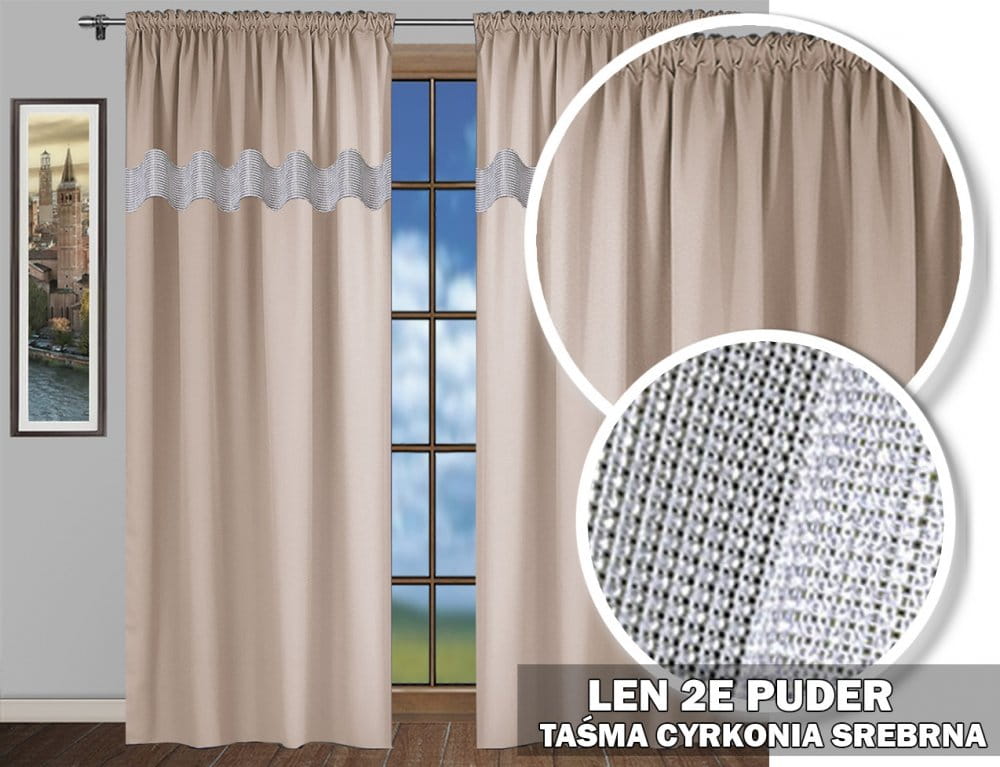 Zasłona u góry wykończona taśmą marszczącą, brzegi obszyte.